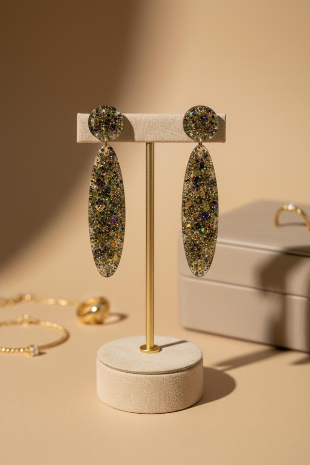 Façonnées à la main dans notre atelier familial à Rennes, les pièces de cette collection révèlent une élégance nocturne et sensuelle. La résine haut de gamme capte la lumière avec douceur, laissant apparaître des reflets champagne scintillants, contrastés par la profondeur du noir, pour un rendu à la fois chic, audacieux et intemporel.