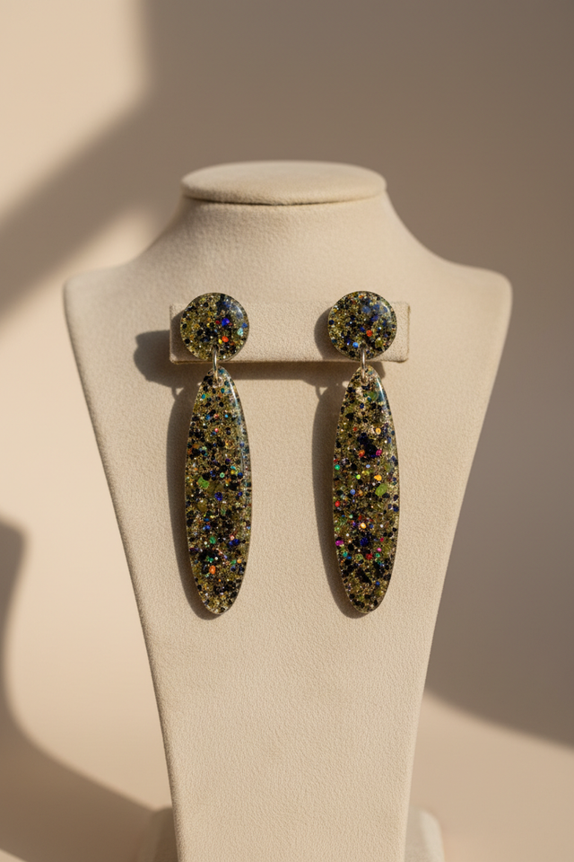 Façonnées à la main dans notre atelier familial à Rennes, les pièces de cette collection révèlent une élégance nocturne et sensuelle. La résine haut de gamme capte la lumière avec douceur, laissant apparaître des reflets champagne scintillants, contrastés par la profondeur du noir, pour un rendu à la fois chic, audacieux et intemporel.