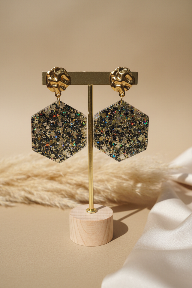 Façonnées à la main dans notre atelier familial à Rennes, les pièces de cette collection révèlent une élégance nocturne et sensuelle. La résine haut de gamme capte la lumière avec douceur, laissant apparaître des reflets champagne scintillants, contrastés par la profondeur du noir, pour un rendu à la fois chic, audacieux et intemporel.