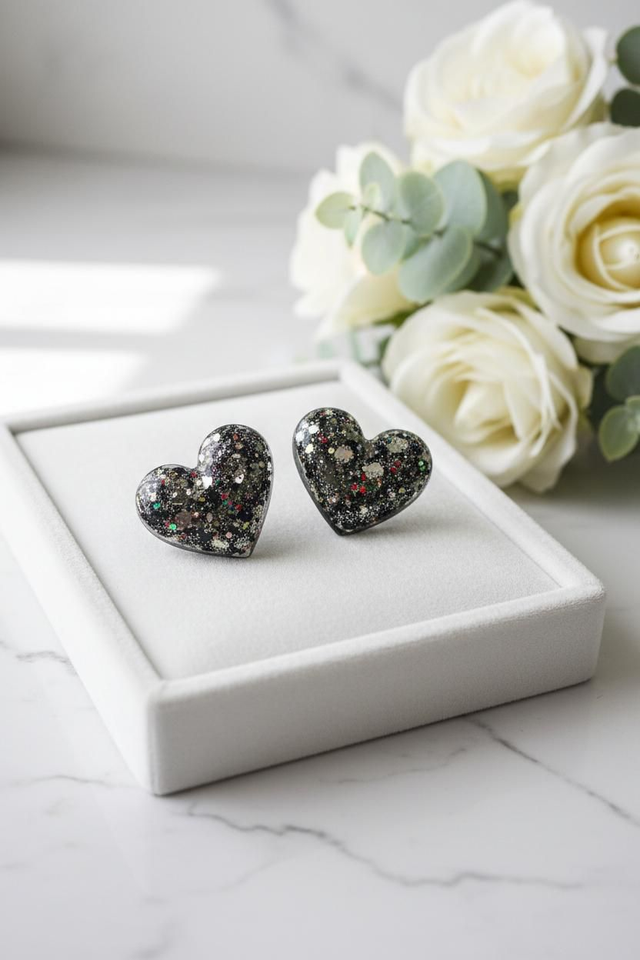 Façonnées à la main dans notre atelier familial à Rennes, les pièces de cette collection révèlent une élégance nocturne et sensuelle. La résine haut de gamme capte la lumière avec douceur, laissant apparaître des reflets champagne scintillants, contrastés par la profondeur du noir, pour un rendu à la fois chic, audacieux et intemporel.
