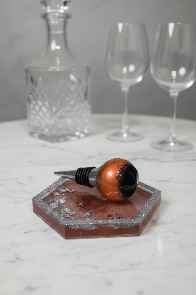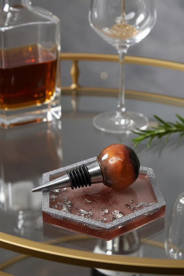 Le bouchon, équipé d’une base étanche en caoutchouc, assure une fermeture hermétique et préserve les arômes de la bouteille entamée. Chaque pièce est façonnée à la main en résine haut de gamme, travaillée avec des pigments fins et délicats qui captent la lumière avec subtilité.