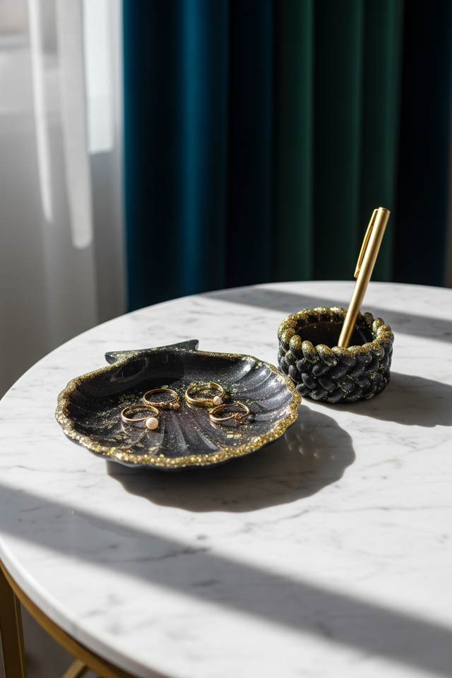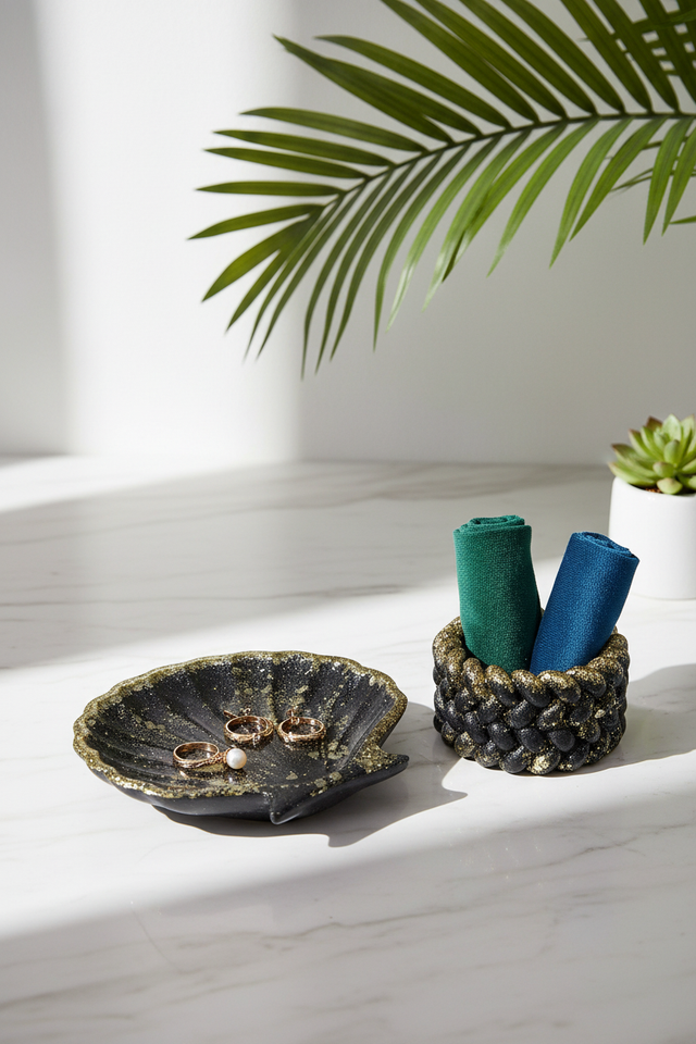 Façonnés à la main dans notre atelier familial à Rennes, ces deux coquillages en résine pailletée deviennent des écrins précieux, pensés pour accueillir bijoux et trésors du quotidien.